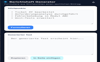 Berichtsheft Generator är en gratis webbläsartillägg för Chrome som förenklar skapandet av Berichtsheft-inlägg. Med hjälp av artificiell intelligens kan användare snabbt generera formella rapporter baserade på angivna punkter. Tillägget är utformat för att vara användarvänligt och effektivt, vilket gör det enkelt att infoga dessa inlägg direkt på en webbsida.